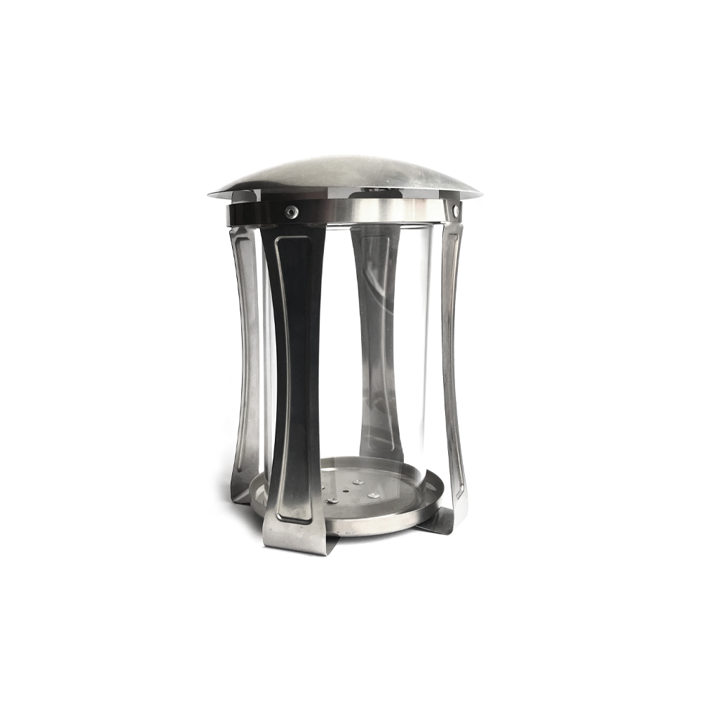 Antikorový sklenený svietnik v prevedení leštený nerez. Rozmer v cm: 18 x 10.5.